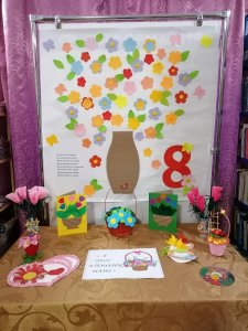 Читатели библиотеки изготовили поздравительные открытки к 8 марта, которые украсили выставку к Международному женскому дню.