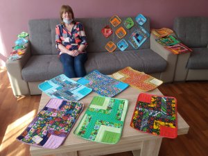 Работы, которые представила Елена, выполнены в технике пэчворк. Каждая ее работа неповторима и уникальна (ланчматы и салфетки под стаканы). В изделиях читается авторская техника приёма, сочетание цвета и фактур, они дарят уют и тепло дому.