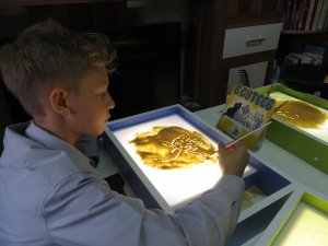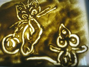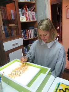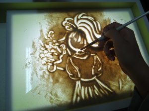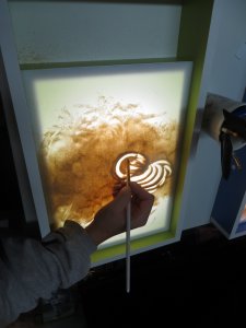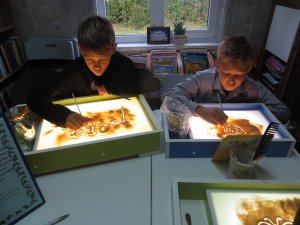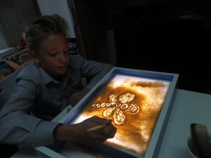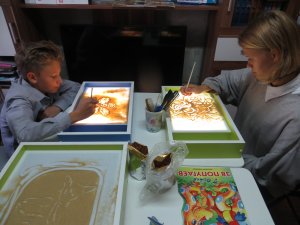 Рисование песком – это очень забавное занятие. Ведь песок тоже является частью живой природы. А рисование песком на светящихся планшетах – это особое занятие для усидчивых, любознательных и увлекающихся ребят. Неспроста во время занятий в библиотеке стоит полная тишина. Только шорох песка, струящегося из ладошек ребят, напоминает о том, что здесь проходит занятие. Рисование песком завлекло ребят так, что они забыли о времени, забыли о том, что они только что приехали из школы. Перед началом занятий заведующая Лермонтовской библиотекой Лукша М.А. рассказала ребятам о технике безопасности при работе на планшетах, познакомила их с материалами, которые можно использовать в процессе рисования. Первое занятие рисования песком – это первый опыт, первые рисунки, первые ощущения красоты обыкновенного песка.