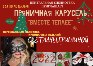 С 15 по 30 декабря в Центральной библиотеке пройдет персональная выставка кулинарных изделий Светланы Гришиной «Вместе теплее». Начиная с XV века пряники — это неотъемлемая часть русской национальной культуры. Ярмарки, народные гулянья, празднества уже не обходились без пряников. В наши дни магазины предоставляют огромный выбор пряников. Но самый вкусный пряник это тот, который сделал своими руками.