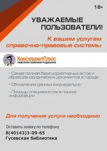 Если вам необходима помощь в поиске законов и нормативно-правовых актов, мы поможем найти необходимую юридическую информацию через базу «Консультант+» и отправим вам на электронную почту по предварительной заявке 8(40143)3-09-65.