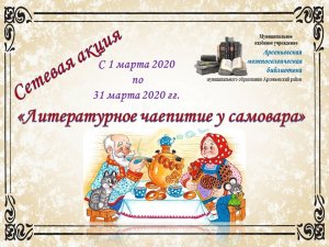 Центральная детская библиотека МБУ «Гусевское библиотечное объединение» присоединяется к сетевой акции «Литературное чаепитие у самовара», организатором которой является муниципальное казенное учреждение "Арсеньевскаямежпоселенческая библиотека" муниципального образования Арсеньевский район.