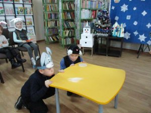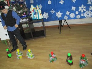 Веселое настроение и смех помогали детям участвовать в играх. В игре «Новогодний боулинг» дети сбивали снежком - мячом кегли, исполняющие роль сосулек, украшенные блестящей мишурой. В игре «Зимний ветер» дети сдували со стола снежинки. Интересными и веселыми были конкурсы. В конкурсе «Найди письмо от Деда Мороза» ребятишкам нужно было из рассыпавшихся букв сложить слово на новогоднюю тему и найти письмо в зале библиотеки. Затем дети отвечали на вопросы новогодних викторин.