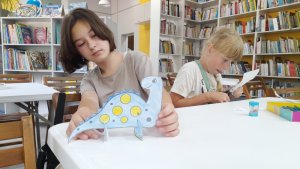 Для ребят из летних пришкольных оздоровительных лагерей Михайловской школы и Калининской школы , школы №5 и школы №1 Гусева прошло игровое мероприятие "По следам динозавров". Дети посмотрели презентацию ответили на вопросы викторины и придумали своих необычных динозавров.